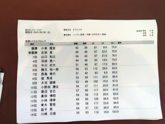 9月7日(日)今年度第1回のクラブコンペが東名カントリークラブで開催されました。残念ながら雨の降りしきる中でのプレイになり、午後雨脚が激しくなったため、ハーフラウンドで終了せざるを得ませんでした。